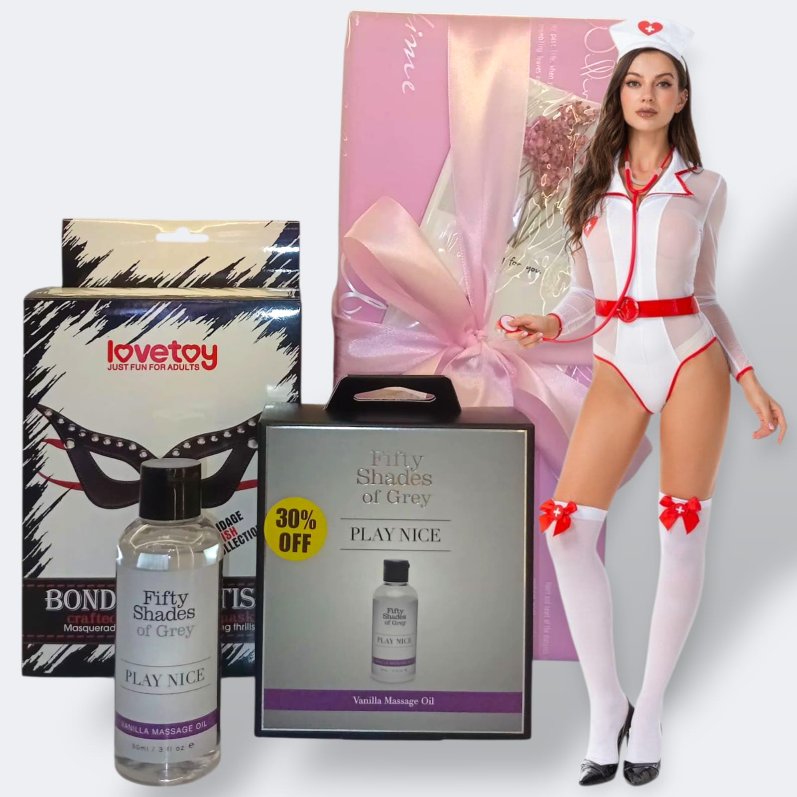 Bundle 7 “Tonight, we’re prescribing a full dose of pleasure… Nurse costumes, masks, and a little oil for a wickedly fun Halloween. #SpookySeduction #CouplePlay”